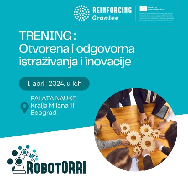 Pozivamo sve istraživače, studente, inovatore i industrijske aktere da nam se pridruže na 𝘁𝗿𝗲𝗻𝗶𝗻𝗴𝘂 𝗸𝗼𝗷𝗶 𝗼𝗿𝗴𝗮𝗻𝗶𝘇𝘂𝗷𝗲𝗺𝗼 𝘂 𝗣𝗮𝗹𝗮𝘁𝗶 𝗻𝗮𝘂𝗸𝗲 (Zadužbina Miodraga Kostića) u okviru projekta RobotORRI. 📅 Ovaj događaj je posebno koristan za istraživače 𝗸𝗼𝗷𝗶 𝗽𝗹𝗮𝗻𝗶𝗿𝗮𝗷𝘂 𝗱𝗮 𝗮𝗽𝗹𝗶𝗰𝗶𝗿𝗮𝗷𝘂 𝗻𝗮 𝗲𝘃𝗿𝗼𝗽𝘀𝗸𝗲 𝗽𝗿𝗼𝗷𝗲𝗸𝘁𝗲, jer će im pomoći da bolje razumeju koncept otvorene... read more →